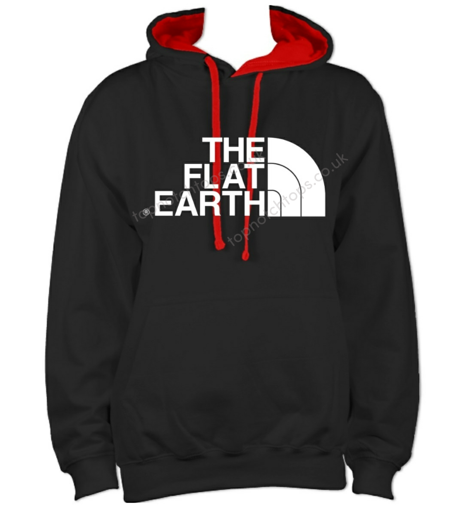 A black hoodie with a red lined hood and cord. And front pocket