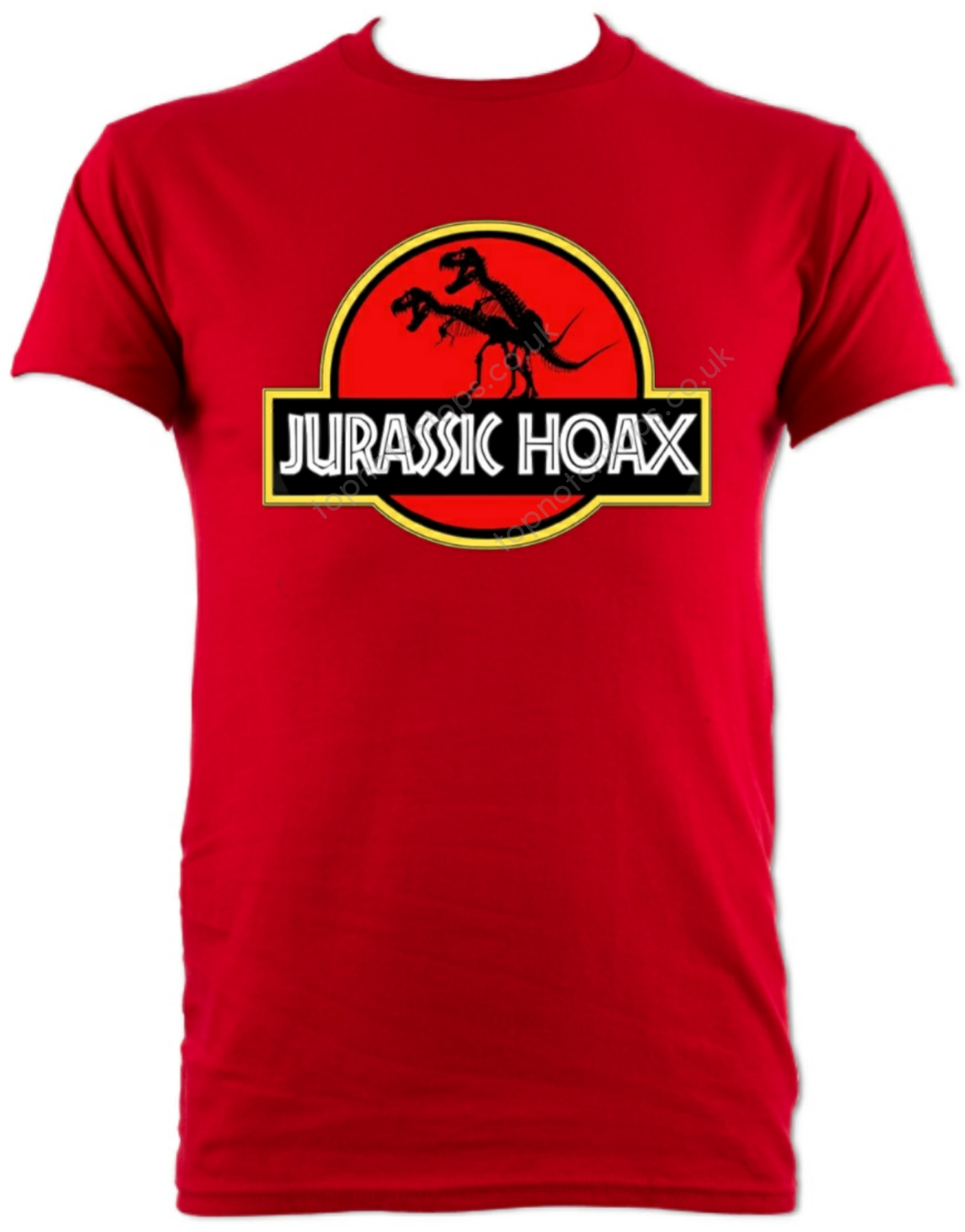 Red dinosaur t-shirt with printed dinosaur logo design. Round neck, great quality. Washes well. For men and women.