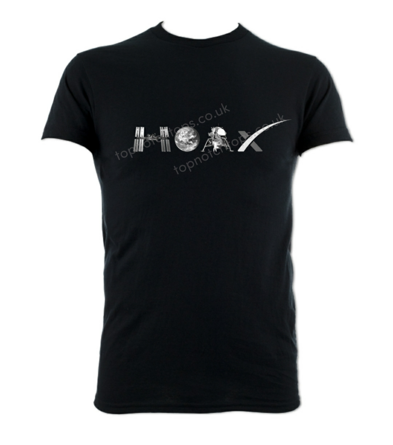 Black Hoax t-shirt with printed Black and white logo design. Round neck, great quality. Washes well. For men and women.