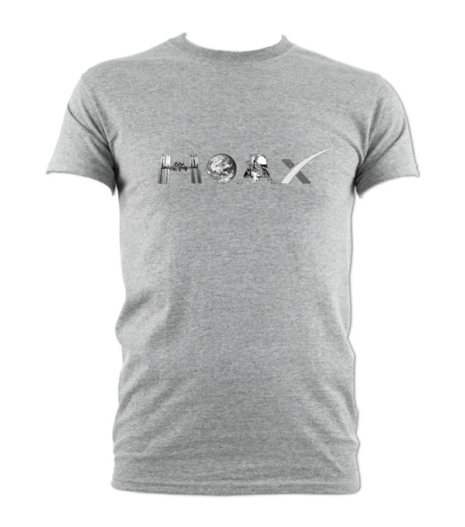 Gray Hoax t-shirt with printed Black and white logo design. Round neck, great quality. Washes well. For men and women.