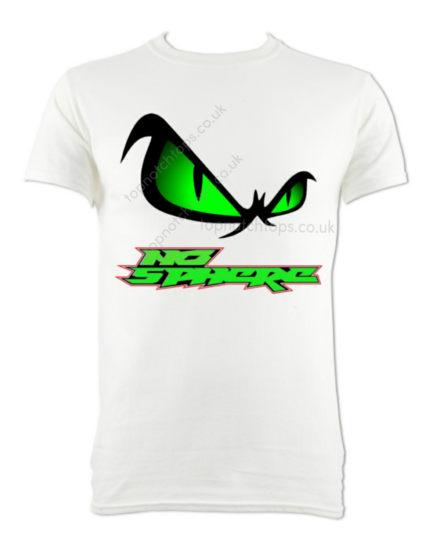 White with Green cats eyes no sphere t-shirt with printed design. Round neck, great quality. Washes well. For men and women.