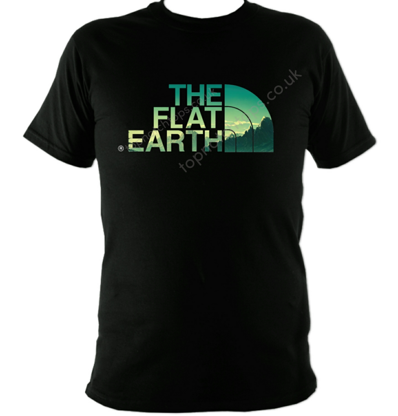 Black t-shirt with A Green Mountain design. Round neck, great quality. Washes well. For men and women.