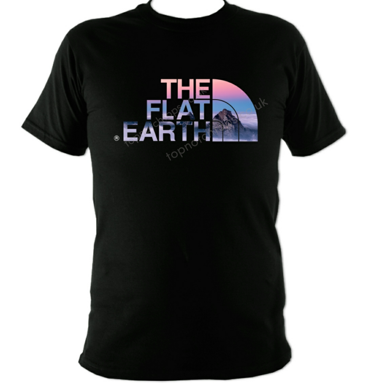 Black t-shirt with A Cloudy Mountains design. Round neck, great quality. Washes well. For men and women.